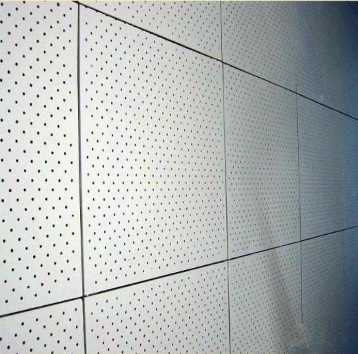 5)安裝硅酸鈣板沖孔吸音板,板與板接縫處留縫5-7mm 用于打嵌縫膏。